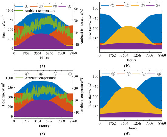 where Ta(t) represents the ambient temperature and is a function of time t []. According to the extreme value of daily temperature, the sine function is used to simulate the daily temperature process []. h represents the surface heat transfer coefficient, which is related to structure orientation and wind speed. Based on the literature and correction with experimental results [], Table 3 shows the convective heat transfer coefficient of the structural surface (1)–(9) shown in Figure 5 and Figure 6. ε is the material emissivity, C0 is Stefen–Boltzman constant, and T0 = 273.15, whose purpose is to convert °C into K. As is the short-wave radiation absorption rate of the structure surface. We refer to other scholars’ studies for specific parameter calculations [], which will not be described here.