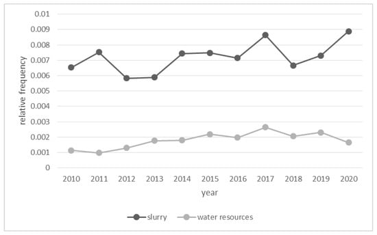 Around one fifth (21%) of all 4227 articles reported on water in relation to slurry. Figure 2 shows the relative frequency (see Section 2.5) of the key term “water resources” and the search term “slurry” throughout the investigation period. The relative frequency indicates the ratio of the search term to the total number of words in the text corpus in each year. Since the number of articles issued varied across years, relative frequency is more suitable than absolute frequency as an indicator for the importance given to water-related topics.