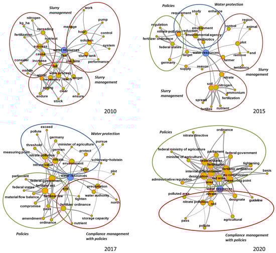 In the earlier years of the investigation period, the root terms related to the slurry–water nexus suggest a predominance of farm-management issues, as indicated by terms such as target, slurry tank, spreading, work process, or manage. In 2010, relations between the key term water resources and the root terms were weak, indicating little coverage of water resources. All clusters in the semantic network of 2010 (presented in Figure 3) deal with slurry management. For example, DLG-Mitteilungen (2010) wrote: “This includes, especially in the northeastern German lowlands, targeted drainage management that retains not only the nutrients but also the water necessary for high yields.” (1). The German original text of the translations are presented in Appendix B. The numbers in brackets refer to the corresponding German sentences in Appendix B.