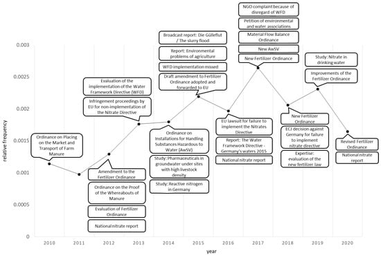 We now relate the results of the semantic network analysis to the sequence of major events, connected to the slurry–water nexus during the investigation period (as compiled in Table A2 in Appendix A). Events related to the slurry–water nexus were identified through searching the word lists as well as studying literature and documents of governmental and non-governmental institutions. We included regulatory and legislative activities and policy events such as major reports, studies and court decisions. Figure 4 shows the events with potential relevance for the slurry-water nexus during the investigation period in connection to the relative frequency of the term water resources.