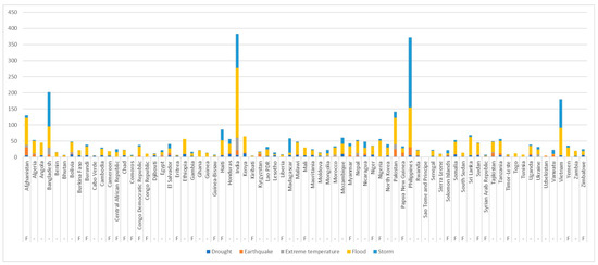 From 1990–2018, a total of 3734 disasters related to natural hazards were recorded in the emergency events database (EM-DAT). Figure 1 illustrates the frequency of each disaster type from 1990 to 2018 in low, lower-middle, and upper-middle-income countries. Over the past 30 years, Asian countries have experienced more disasters than any other region. The cumulative number of disasters for East and South Asia between 1990 and 2018 was 3501, which accounts for 40.1% of the total reported disasters around the world in the same period. Floods occurred more often than any other type, accounting for 46.8% of incidents, followed by storms at 32.7%, and earthquakes at 9.2%. Bangladesh, Pakistan, and Vietnam have faced relentless floods over the past three decades. Because of under-reporting in low- and lower-middle income countries due to the difficulty of tracking disasters, the actual number of incidents in those places is expected to be higher.