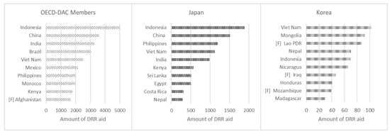 Figure 2. compares the top 10 recipient countries of Japan and Korea with those of OECD-DAC members as a reference. The main recipients of Japan’s DRR aid throughout 2006–2019 were Asian countries, with 7 out of 10 being in East and South Asia; none of these countries were FCSs. In the case of South Korea, the composition of the top 10 recipient countries were more diverse, with four East and South Asian countries, two Central American countries, two Sub-Saharan African countries, and one Middle East country; three of these were FCSs (marked with [F] in the figure). However, 6 out of these 10 are Korea’s priority partner countries (Vietnam, Mongolia, Lao PDR, Nepal, Indonesia, and Mozambique), meaning they were meant to receive Korea’s aid regardless of their state of danger. As for the OECD countries, only one recipient country was a fragile state.
