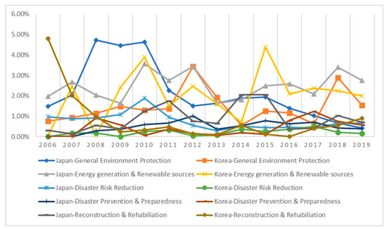 Figure 3 shows that none of the five DRR sub-sectors exceeded 5% of the total ODA in 2006–2019. Korea’s allocation for reconstruction and rehabilitation and Japan’s allocation for general environment protection rose close to 5% immediately following their endorsement the of Hyogo Framework in 2005, but this did not sustain over time. While investment in all DRR sectors was marginal, constituting less than 1% of the total ODA over time, the amount allocated for the sector of energy generation and renewable sources has fluctuated the most for both countries. Overall, there was no sign of sufficient support for DRR from both countries.