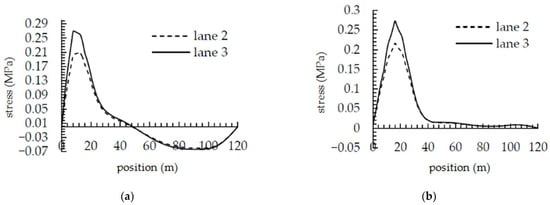 Table 4 shows that the most common vehicles that cause fatigue damage to suspenders on this road section are V6 and V9. The heaviest vehicle is the V9 model, with a weight of 404 kN, which may become the model with the greatest impact of fatigue damage. It is worth noting that V6, as the vehicle with the highest frequency, is second only to V9. It may also be the vehicle with the greatest impact of fatigue damage. Therefore, the V6 and V9 models are loaded to obtain the stress–time history curves. As shown in Figure 3 and Figure 4, the vehicle type with the most influence on fatigue damages is judged.