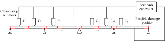For the above question, a multigain scheme is proposed in which each subsystem with a single gain is designed for each span. In this case, we only need to focus on the local structure rather than the whole structure, and only a few actuators installed on the target span can effectively enhance the sensitivity to the local damage of each span. A diagram of the single-gain subsystem designed for the target span of a multispan structure is shown in Figure 2. It is clear that only a minimum of two actuators can achieve the proposed multigain scheme, which is feasible in practice.
