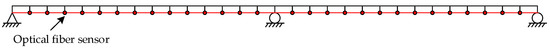 To verify the validity of the proposed approach for the local microdamage of multispan structures, a two-span beam model, each with a span of 15 m + 15 m, is selected as a numerical example in this section. The beam model is simulated and divided into 30 elements using MATLAB, and the structural parameters are displayed in Table 1. To collect the dynamical strain responses, the distributed fiber sensor is simulated to be pasted at the bottom of the beam structure, and the dynamic strain data of the measured points are generated and acquired, as shown in Figure 5.