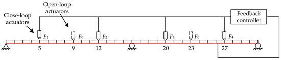 To assign the designed closed-loop system, four closed-loop excitation points (#5, #12, #20, and #27 nodes) and two open-loop excitation points (#9 and #23 nodes) n total are selected, as displayed in Figure 6. The closed-loop actuators are applied with feedback forces that are calculated in real time through a feedback controller, while the open-loop actuators are applied with Gaussian white noise with zero mean. In addition, the signal sampling frequency is 150 Hz.