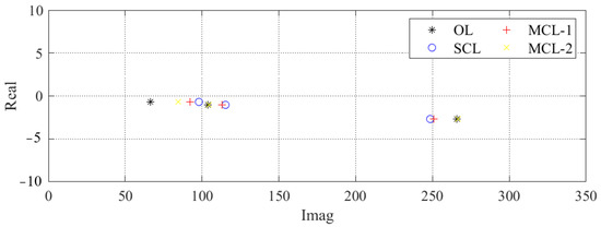 As shown in Figure 7, we assign the first three poles of the bending modes in larger positions and move the neighboring poles closer to enhance the sensitivity of strain mode shapes to local damage. Specifically, the first three poles of the single-gain, closed-loop (SCL) system are located at , , ; for the subsystems of the multigain closed-loop (MCL) system, the closed-loop poles are assigned at , , and , , . Clearly, the SCL system can reach larger poles because it has more actuators to keep the system stable and robust.