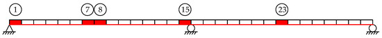 To verify the validity of the damage diagnosis approach in this study, considering that the closed-loop damage detection method aims at finding early damage, seven various damage conditions with minor stiffness reduction (by decreasing Young’s modulus) for various elements are simulated. The areas of potential damage are located at elements 1, 8, 15, and 23, as shown in Figure 8. The specific damage patterns include three single-element damage conditions, and three multielement damage conditions are displayed in Table 3.
