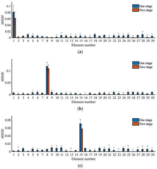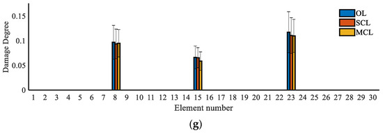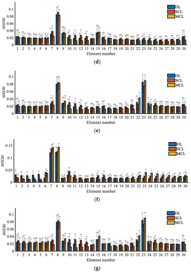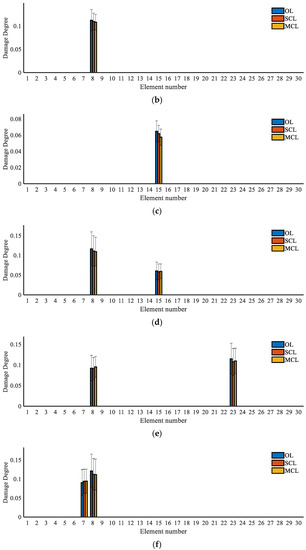 Thus, the elements with a data peak of the MSEBI values are regarded as the possible damaged elements in this study, and the determination results are displayed in Table 4. We can see that all the systems have good location ability to find the actual damaged area. However, we must mention that the above results are obtained based on the statistical analysis for the 200 sets of noise-polluted data, which means that the identified results may have errors in a single independent test, and the identification accuracy will be strongly affected by the anti-noise performance of each system. Then, we can confirm that the closed-loop system is more stable in damage detection, while the MCL system can have better performance than the SCL system.