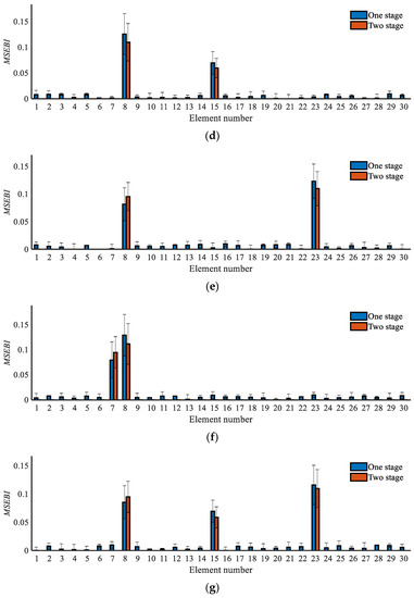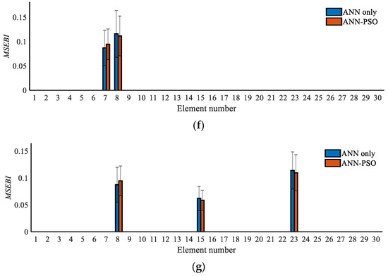 Damage localization results based on the MSEBI method: (a) Case 1; (b) Case 2; (c) Case 3; (d) Case 4; (e) Case 5; (f) Case 6; (g) Case 7.