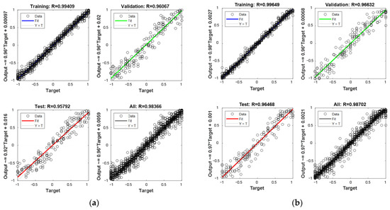 Figure 13 shows the regression of the training process, which indicates the difference errors between the expected outputs and the real outputs for training, validation, and testing. We can see that the data trend lies along the 45-degree line, and both regressions of the ANN-PSO and ANN-only methods are larger than 0.96 for the whole damage cases, all of which demonstrate a good training effect.