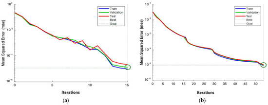 Regression of the training process for the simulated example—single damage: (a) ANN-PSO; (b) ANN-only.