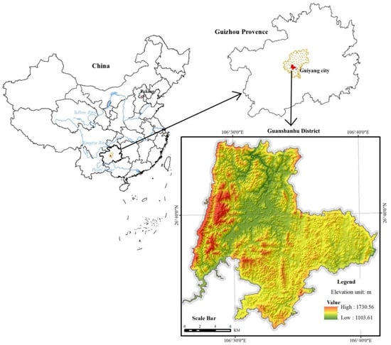 Guanshanhu District is located in the central karst zone of Qianzhong Mountain, northwest of Guiyang City, Guizhou Province, China. The total area of the district is nearly 30,700 ha, with a permanent population of 0.65 million by 2020 []. The District was newly established in 2012, before which the area was rural and sparsely populated. The area is part of the Maotiao River and the Nanming River watershed in the upper reaches of the Yangtze River []. The area is in the subtropical monsoon zone with a warm temperate climate, the annual average air temperature is 15.1 °C, and annual precipitation ranges from 1200 to 1400 mm []. The area’s karst background resulted in a variety of landforms. Hills, basins, valleys, and depressions are interlaced, revealing a spatial distribution pattern of half the landscape and half the city (Figure 1). In this area, there are a diverse range of ecosystems. The forest, farmland, and freshwater ecosystems in the west occupy nearly half of the total area in the District, providing crucial ecological services, such as climate regulation, air purification, soil and water conservation, biodiversity habitats, and cultural, historical, or recreational benefits. These environmental services are important not only to the residents in the district but also to the entire city of Guiyang [].