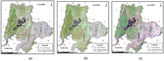 Remote sensing images of Guanshanhu District (a) Landsat TM image of Guanshanhu District in 2000 (b) Landsat ETM+ image of Guanshanhu District in 2010 (c) Gaofen2 image of Guanshanhu District in 2020.