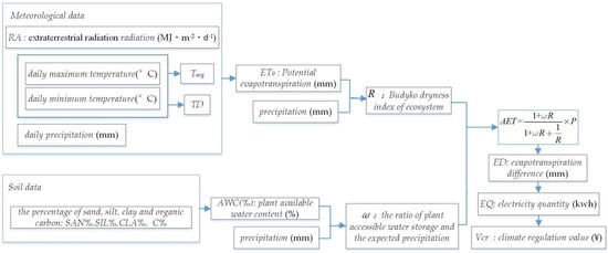 - The calculation flowchart. The forest ecosystem’s climate regulation value calculating flowchart is shown in Figure 3.