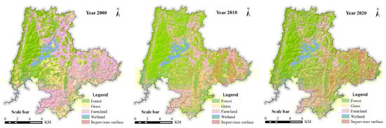 Using automatic and human-computer interaction remote sensing image processing based on multi-source data, the dynamic changes of ecosystem spatial patterns in Guanshanhu District in 2000, 2010, and 2020 were analyzed and are shown in Figure 4.