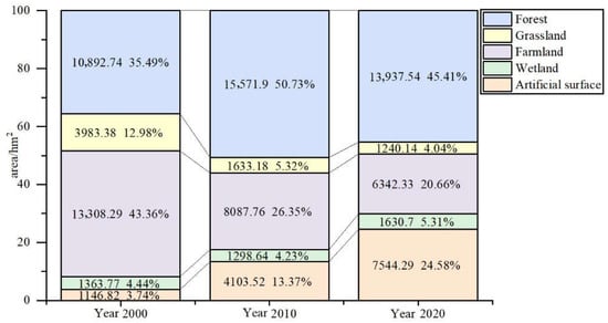 According to the attribute statistics in Figure 4, the dynamic changes in the ecosystem structure in the Guanshanhu District in 2000, 2010, and 2020 were analyzed and are shown in Figure 5.