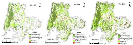 Forest ecosystem structure of Guanshanhu District in 2000, 2010, and 2020.