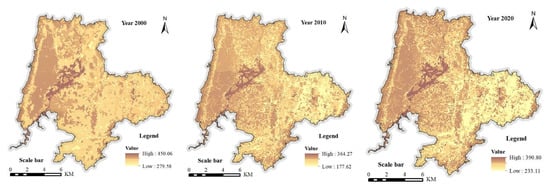 According to the actual evapotranspiration calculation method mentioned above, the annual AET of different ecosystems in the District in 2000, 2010, and 2020 are calculated by ARCGIS spatial modeling, and the spatial distribution patterns are shown in Figure 7.