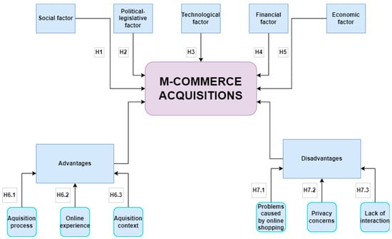 The outcomes of our empirical research highlighted some of the key factors that influence m-commerce acquisitions as follows: social, political-legislative, technological, financial, and economic. Despite the fact that other studies identified and presented a relatively small number of items related to some of these factors [,,], our research identified new ones and tailored these results to the case of Romanian undergraduate students, in the context of the COVID-19 pandemic.