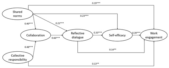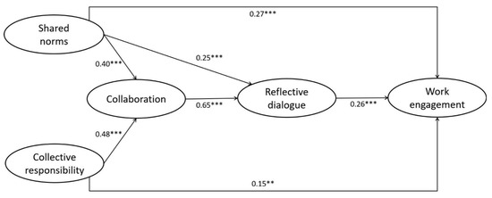 Figure 2. The relationships among the four dimensions of the professional community and teachers’ work engagement (Model 1); ** p < 0.01, *** p < 0.001.