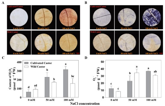 ROS production of leaves in three true leaves from cultivated and wild castor with or without NaCl treatment. (A) Hydrogen peroxide (H2O2) content detected by 3, 3′-Diaminobenzidine (DAB) staining in leaves of three true leaves from cultivated and wild castor. (B) Superoxide anion (O2−) content detected by Nitro blue tetrazolium chloride (NBT) staining in leaves of three true leaves from cultivated and wild castor. Values are means ± SD based on three biological experiments. (C,D) H2O2 content and O2− content; (C,D), gray column belongs to cultivated castor and white column belongs to wild castor in the leaves of three true leaves from cultivated and wild castor. Different lowercase letters mean significance of differences (p < 0.05) between the different groups.