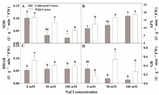SOD (A), APX (B), DHAR (C), and GR (D) activities of leaves in three true leaves from cultivated and wild castor with or without NaCl treatment (0 mM, 50 mM and 100 mM NaCl). Values are means ± SD based on three biological experiments. Different lowercase letters mean significance of differences (p < 0.05) between the different groups.
