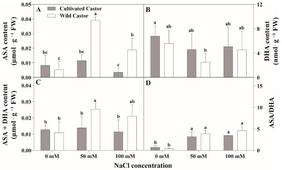 The contents of ascorbic acid (AsA) and oxidized ascorbic acid (DHA) of leaves in three true leaves from cultivated and wild castor with or without NaCl treatment (0 mM, 50 mM and 100 mM NaCl). (A) ASA content; (B) DHA content; (C) ASA + DHA content; (D) ASA/DHA ratio. Values are means ± SD based on three biological experiments. Different lowercase letters mean significance of differences (p < 0.05) between the different groups.