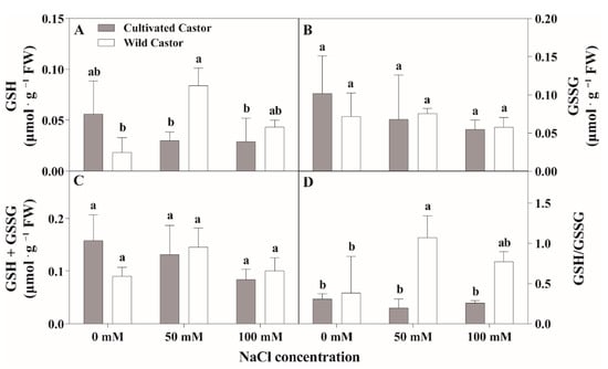 The contents of reduced glutathione (GSH) and oxidized glutathione (GSSG) of leaves in three true leaves from cultivated and wild castor with or without NaCl treatment (0 mM, 50 mM and 100 mM NaCl). (A) GSH content; (B) GSSG content; (C) GSH + GSSG content; (D) GSH/GSSG ration. Values are means ± SD based on three biological experiments. Different lowercase letters mean significance of differences (p < 0.05) between the different groups.