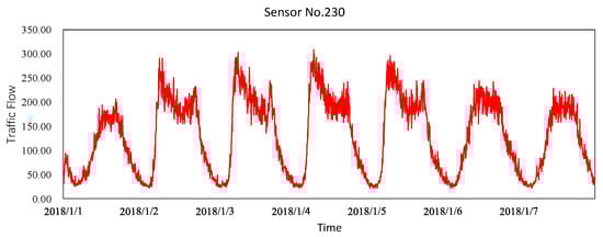 As an important aspect of urban construction and sustainable development, transportation promotes the flow of population, commodities, economy, information and other elements between regions, and it has an important function for social and economic development [1]. However, the continuous growth of car ownership has placed great pressure on the road traffic system. The resulting problems such as road congestion, increasing accidents and worsening pollution have greatly reduced people’s quality of life and limited the sustainable development of cities [2,3]. An intelligent transportation system (ITS) is a promising method to reduce urban traffic congestion, which has become an important component of smart cities [4]. The intelligent transportation system is a technology economic system that uses various high-level and new technologies, such as computer technology, wireless communication technology, artificial intelligence (AI) and other advanced technologies, to improve traffic efficiency, traffic safety level and environmental protection [5]. The issue of short-term traffic flow prediction is one of the basic, key problems in ITS. Real-time and accurate traffic flow prediction is the scientific basis for a transportation department to take steps to alleviate congestion, such as through traffic control and guidance. Moreover, traffic signal control, urban road system planning and navigation systems based on traffic flow prediction all play an important role in alleviating urban traffic problems. Therefore, traffic flow prediction from the perspective of the urban traffic system has clearly practical significance for realizing urban sustainable development. For this reason, traffic prediction has attracted the attention of many researchers in recent years. However, it is still a challenge due to the complex spatiotemporal trends, time variance and nonlinear characteristics of traffic data. Some of the features of traffic flow are as follows: