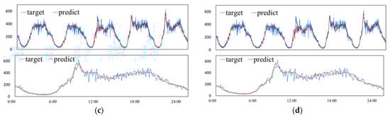 Figure 8 shows the overall performance of our model. From Figure 8, we can see that with an increase in the prediction timestep, the difficulty of prediction increased gradually, and the prediction error of the model became larger. To better show the prediction results of our proposed model, we randomly choose one road on the dataset and visualize the prediction results. Figure 9 shows the visualization results for prediction horizons of 5 min, 15 min, 30 min and 60 min. We can see the prediction error between the predicted value and the ground truth for one road segment in a given period in Figure 9. We can find that the variation trend for traffic flow predicted by our model was generally consistent with the variation trend to the real values. However, the curve of the predicted value of the model is smoother than that of the real value.