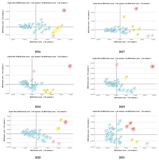 The next stage of the study aimed to create a territorial profile of the offences, that is, map the predilection for offences with the chromatic accentuation of the areas with an increased risk of noncompliance. The methods used in this analysis stage were hierarchical clustering and K-means clustering. The structure of the clusters, resulting from the cluster membership outputs corresponding to each analyzed year, is presented in Figure 2.