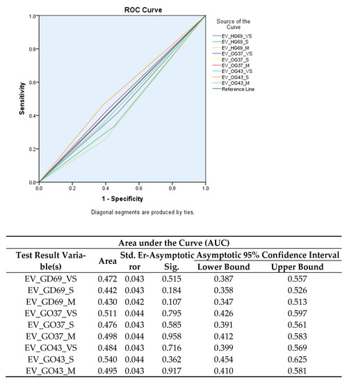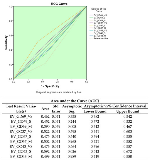 Figure 3 shows the centralized dynamics of nine ROC curves calculated for the evolution of each category of fines issued: EV_GD69, EV_GO37, and EV_GO43, for each level of severity: VS, S, and M, in relation to the evolution of exports of goods and products.