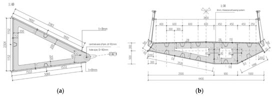 The cross-section of the arch is designed as a steel box. The height and width of the section decrease linearly from the arch foot to the dome. The main girder adopts a flat steel box structure. The girder is 0.8 m in height, the plate thickness is 22 mm, the top plate of standard section is 4.0 m in width, and the bottom plate is 0.9 m in width. The hanger is sealed with a diameter of 50 mm. Typical sections of arch and girder are shown in Figure 2.