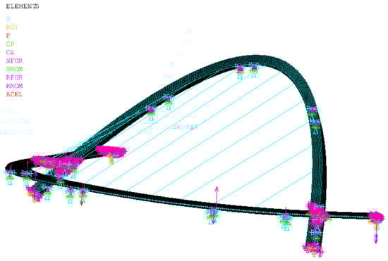 The main components of the inclined single-side suspension steel arch bridge are: arch rib, girder, hanger, crossbeam, and lateral bracing. These elements are all made from one main material: steel, which has a mass density of 7850 kg/m3, modulus of elasticity of 21.1 GPa and Poisson ratio 0.25. In general, for the FE modeling of the bridge by using ANSYS program, quadrilateral 4 nodes SHELL181 element is used for representation of steel components, and LINK180 element for modeling of the hanger.