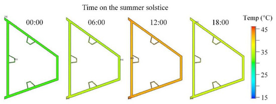 To discuss the environmental effect of the extreme solar state, the change of temperature distribution in the arch cross-section, on the summer solstice, is shown in Figure 4, with the solution of the FE model.