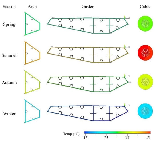 With the environmental data of different seasons, the corresponding temperature distributions in the cross-section of the arch, girder, and hanger can be calculated, which are shown in Figure 5. Considering the main structures of the bridge are made of steel, thermal conductivity is good. Therefore, the internal temperature gradient of the structure section is not obvious, and the temperature of the section can be simplified to a unified temperature. Based on this assumption, the sectional average temperature can be considered as the component temperature in the following research on temperature load and effect.