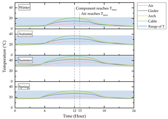 Based on the result analysis in Figure 6, the temperature difference between air and components in day or night and different seasons can be calculated, which is presented in Table 2. The results show that the temperature difference between different components and the environment is significantly affected by season. The temperature difference is around 5.5 °C between the environment and girder and around 11 °C between the environment and hanger, which is relatively stable. But the temperature between the environment and arch is variable in different seasons, which ranges from about 7.11 °C to 12.36 °C. The temperature difference of bridge components in different seasons is relatively small at night. In the daytime, the difference between the arch and hanger is large, at around 5.5 °C in spring and summer, and the difference between the arch and girder is large, at around 6 °C in autumn and winter.