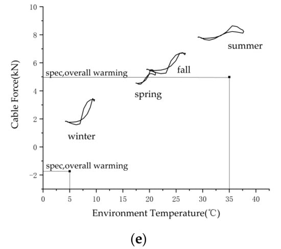 Structural response with actual environmental thermal load. (a) Transverse displacement. (b) Longitudinal displacement. (c) Vertical displacement. (d) Girder-arch relative displacement. (e) Cable force.