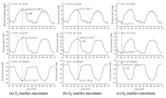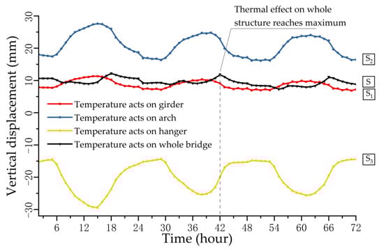 The temperature distribution in girder, arch, and hanger, obtained by analysis, are applied to the FE model of the whole bridge. The time-dependent structural thermal effect under the action of temperature fields on different components is respectively calculated, and the structural displacement is analyzed for combination, which are shown in Figure 8. Substituting the thermal effect caused by different components’ temperature distribution into Equations (8) and (9), the corresponding thermal effects (vertical displacement of girder), , and , can be combined by Turkstra’s rule as normal loads.