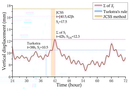 To consider all of the adverse case, a similar combination method proposed by JCSS was found to compare with Turkstra’s rule. The JCSS method assumes the variable load sample to be a stationary binomial process, and then searches the local maximum of another load during the duration of one load maximum. The combined thermal effect with the JCSS method is obtained, which reaches the maximum value, 17.5 mm, between 40.5 and 42 h. This result is also shown in Figure 10. It can be seen from the figure that Turkstra’s rule is more accurate in calculating the maximum, compared with the JCSS method, but it cannot consider all the adverse case. While the JCSS method has the ability to locate the occurrence time of the maximum, it is too conservative due to the stationary binomial process assumption.