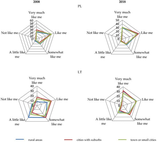 In 2018, however, no significant differences were found between the perception of nature as positive by inhabitants of rural areas and large cities or towns. The highest percentage of responses in Poland, regardless of the place of residence, was the answer ‘like me’ (important nature), and it was the highest in large cities. In Lithuania, the answer ‘very much like me’ (nature very important) was most often indicated, both in the rural areas and in cities. There were visible changes in the inhabitants’ attitudes over time, when concern for nature was increasing. In particular, in Lithuania, a similar perception of natural values as positive by the inhabitants could be noticed. Changes in attitudes over time were very clearly visible in rural areas, where, in 2008, 7.7% of the inhabitants chose the ‘very much like me’ answer, whereas, in 2018, it was already 30.4%.