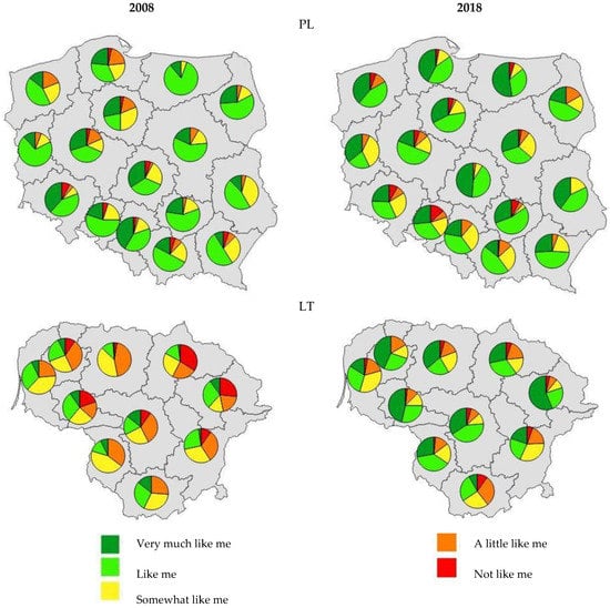 The perception of nature as a value also varies regionally and by rural areas (Figure 3). In Poland, a relatively high level of care for the natural environment was found among the rural residents in all regions, both in 2008 and 2018. In 2018, the greatest concern for the environment was expressed by the residents of Łódzkie, Pomorskie, Świętokrzyskie, Warmińsko-Mazurskie, Zachodniopomorskie, and Lubelskie voivodships (over 80% of the total responses). The relatively smallest percentage of people described nature as an important value for them in the regions of western Poland, i.e., in Lubuskie, Dolnośląskie, and Śląskie voivodships (less than 60% of the total responses). This may be due to the industrial nature of these areas. Lithuania had a lower level of concern for the natural environment than in Poland. However, in all regions of Lithuania, there were clear changes over time, with increasingly more people recognizing the concern for nature as very important or important for them (answers of “very much like me” and “like me”). In 2018, the highest percentage of these indications was found in the following regions: Taurage and Kaunas (approximately 73% of all responses), and the lowest in the regions: Alytus and Vilnius (less than 40%).