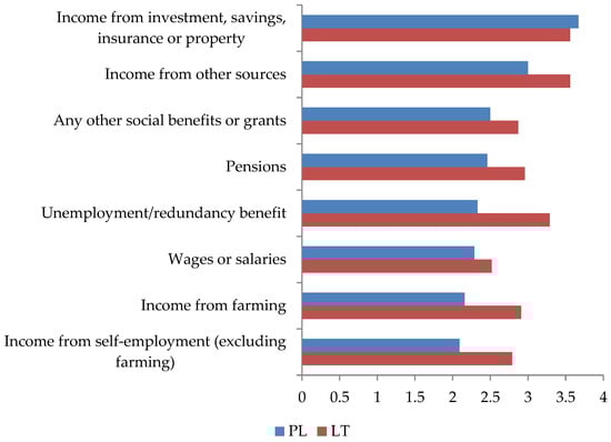 Rural residents’ responses in Poland (PL) and Lithuania (LT) by income in 2018 (medium score). Answers scale: very much like me (1), like me (2), somewhat like me (3), a little like me (4), not like me (5), not like me at all (6). Source: own compilation based on ESS Round 9.