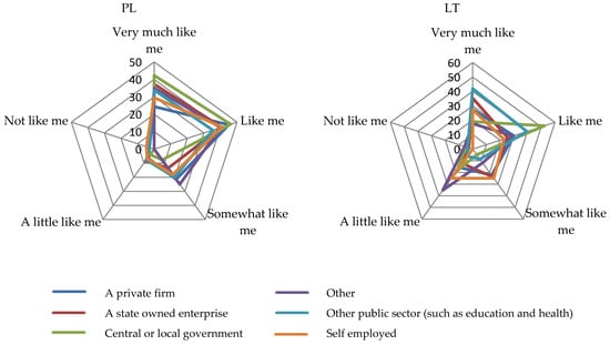 Rural residents’ responses in Poland (PL) and Lithuania (LT) by the type of organization (workplace) in 2018 (%) (ESS question: Looking after the environment is important to him). Source: own compilation based on ESS Round 9.
