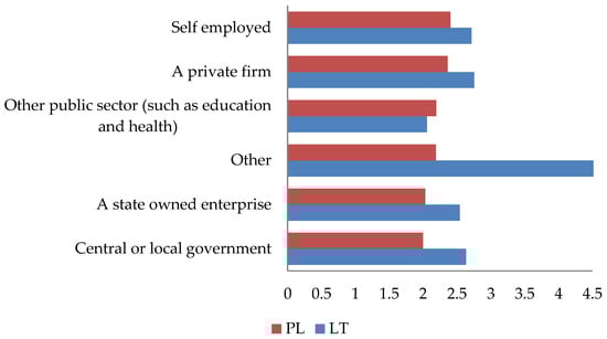 Rural residents’ responses in Poland (PL) and Lithuania (LT) by the type of organization (workplace) in 2018 (medium score). Answers scale: very much like me (1), like me (2), somewhat like me (3), a little like me (4), not like me (5), not like me at all (6). Source: own compilation based on ESS Round 9.