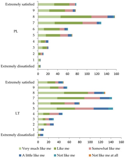 Caring for the environment and the satisfaction with life of rural residents in Poland (PL) and Lithuania (LT) in 2018 (number of responses). The Likert scale was used to assess satisfaction with life, where 0 means extremely dissatisfied, 10—extremely satisfied). Source: own compilation based on ESS Round 9.