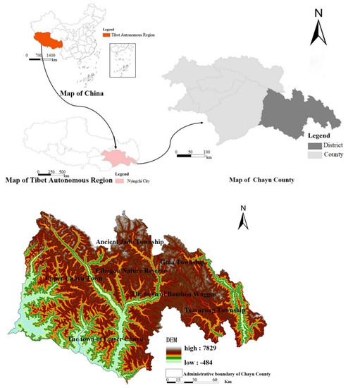 Chayu county is a typical area of Southeast Tibet with high mountains and valleys in the western section of Hengduan Mountains (Figure 1). The terrain is high in the northwest and low in the southeast, with a wide vertical height difference. Affected by the Indian Ocean warm current in the south and clamped by derma snow mountain in the north, the high altitude and undisturbed natural environment jointly determine the high sensitivity of the ecosystem. The county covers an area of 31,400 km2, with forest land taking the absolute advantage, followed by grassland and unused land. The unique topography, climate and hydrothermal conditions make it one of the regions with richest Mountain Biodiversity in Tibet and even China. Having a variety of ecological types and rich biological resources, with forests, wetlands, grasslands, lakes, deserts and other ecosystems distributed, the ecosystem in this county is extremely fragile and has poor anti-interference ability. Once damaged, it is difficult to recover and biodiversity is facing severe challenges. It is extremely important to carry out the research on the value of land-use ecosystem services in this region.