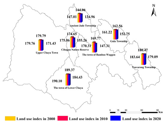 Spatial distribution of land use index in study areas, 2000–2020.